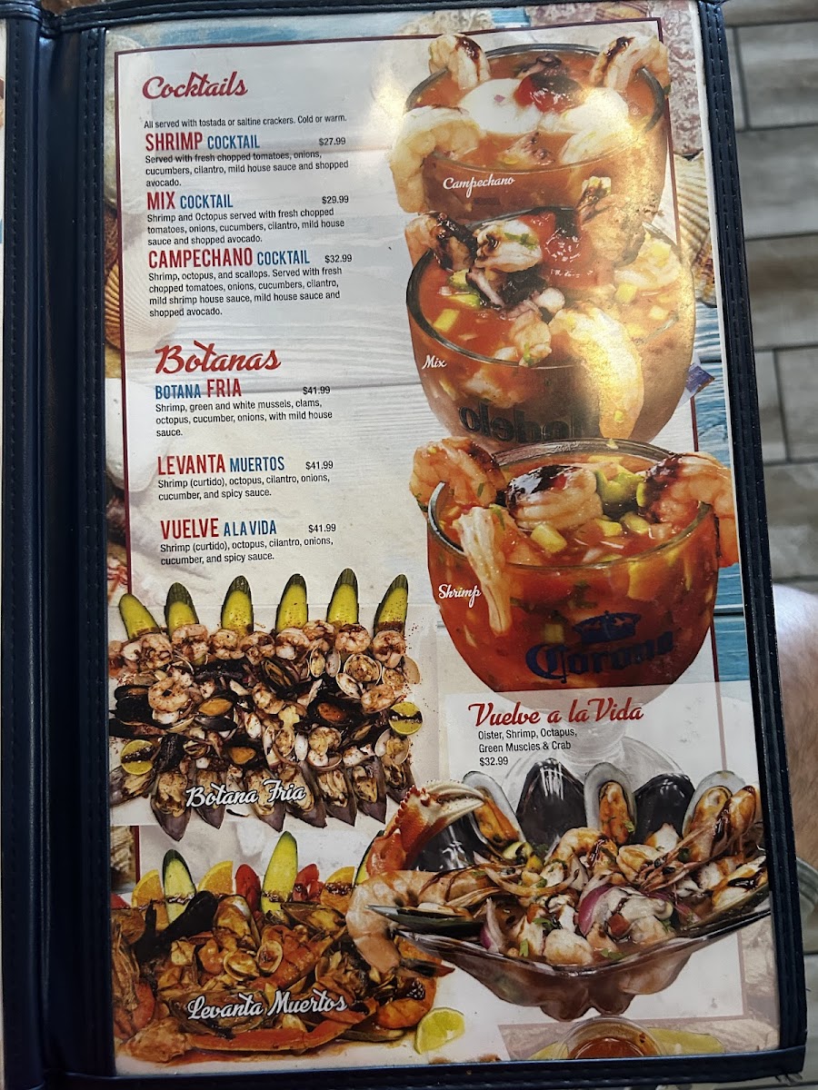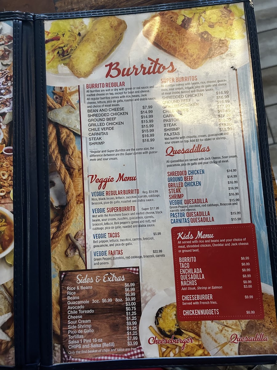 Highlights include mouthwatering seafood specialties like their sought-after Shrimp Cocktails and flavorful Shrimp Plates, each priced at $21.99 to $29.99. For those craving a heartier meal, delightful options such as burritos, tacos, and enchiladas are available, all priced at a reasonable $8.99, ensuring a satisfying experience for both adults and children.